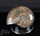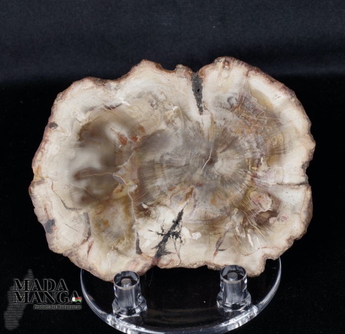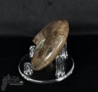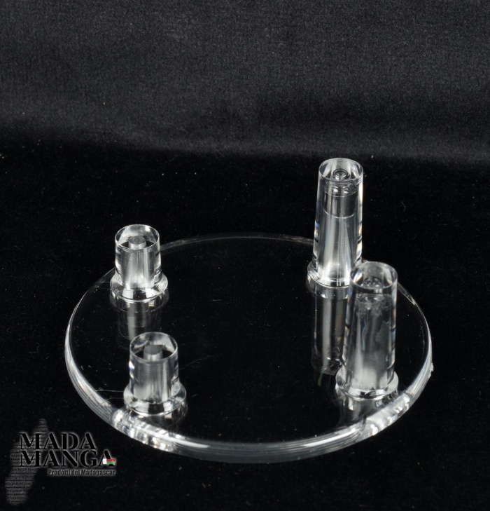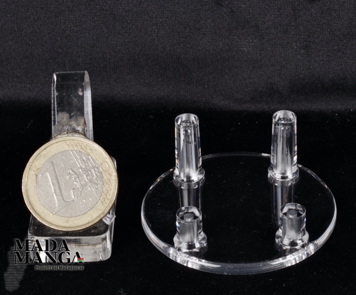 Supporto in plastica a base tonda adatto per fette di legno fossile o di minerali e per ammoniti, dimensione base diametro cm.5, altezza piedini di appoggio posteriori cm.1,7.