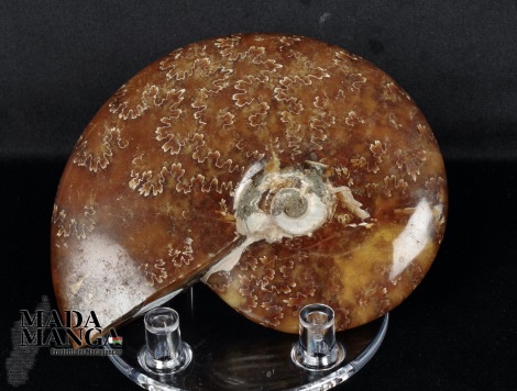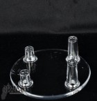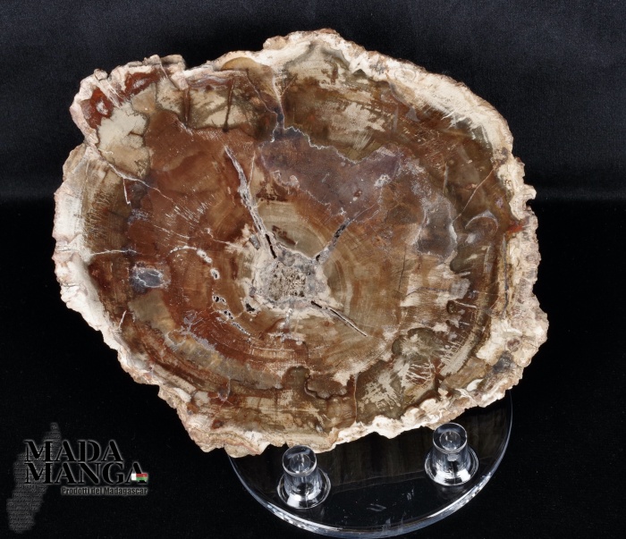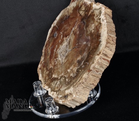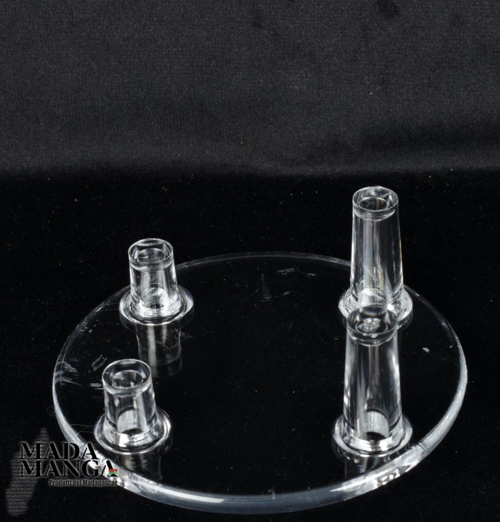 Supporto in plastica a base tonda adatto per fette di legno fossile o di minerali e per ammoniti, dimensione base diametro cm.7, altezza piedini di appoggio posteriori cm.2,2.