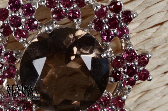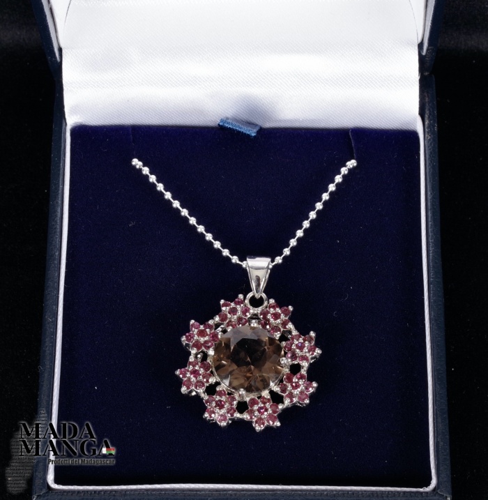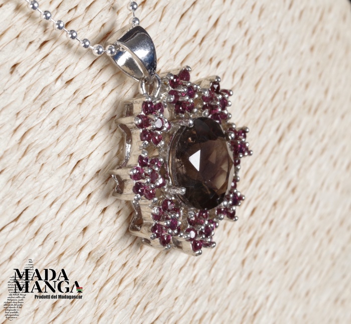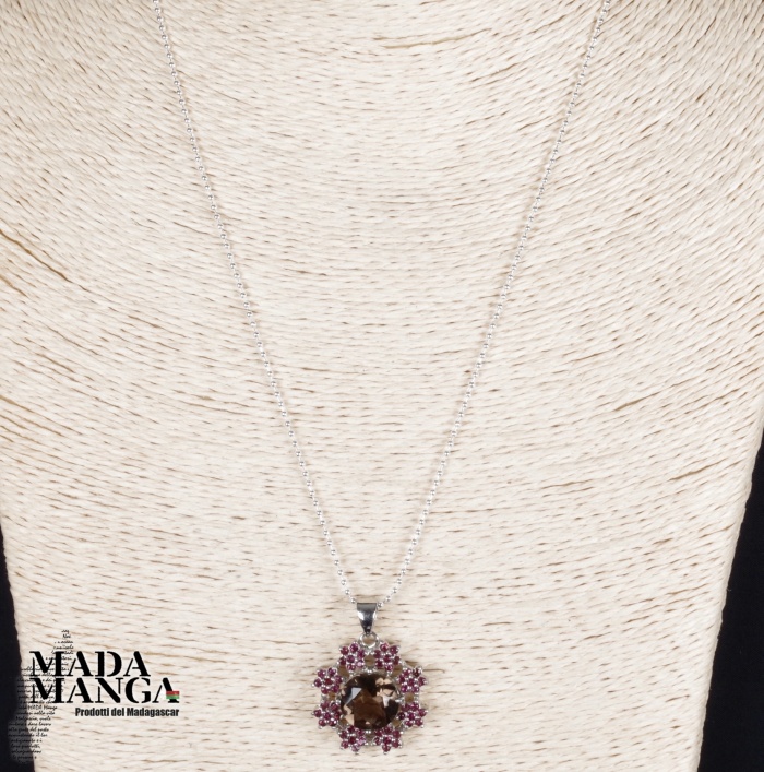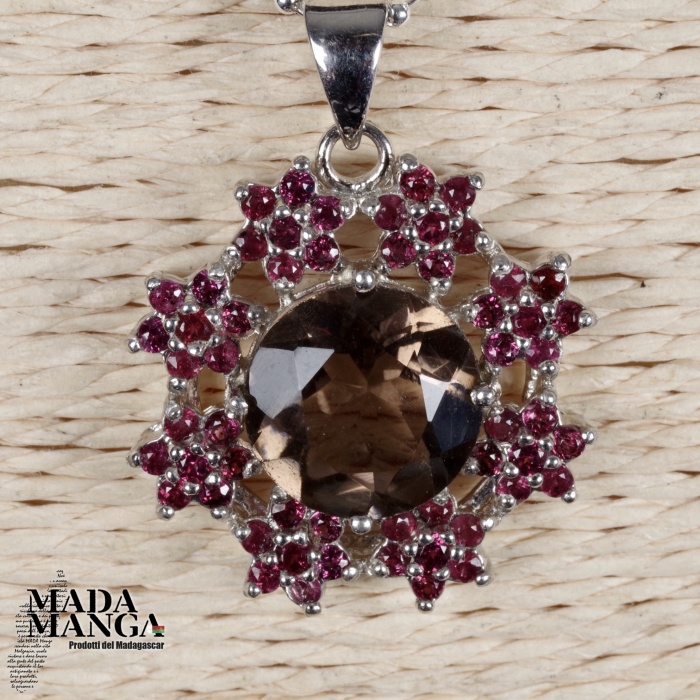 Ciondolo in Argento 925 con placcature in oro bianco, con quarzo fumè da mm.12 e piccole rodoliti disposte a fiore, dimensione ciondolo mm.24x24, peso 6 grammi. Venduto con scatolina regalo e con catenina placcata argento.
