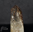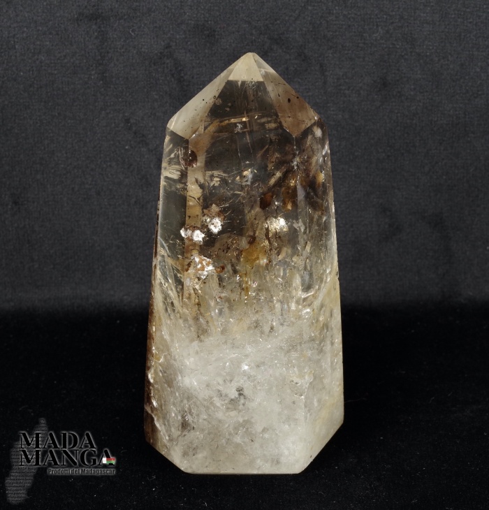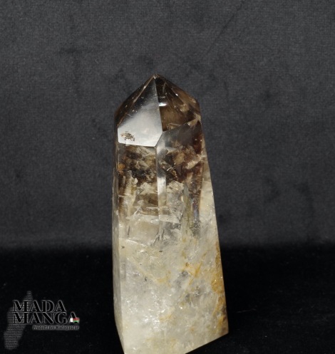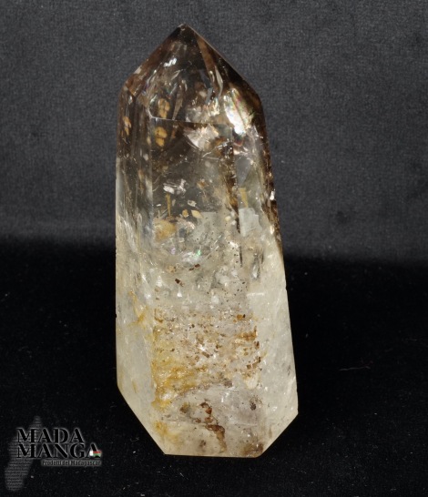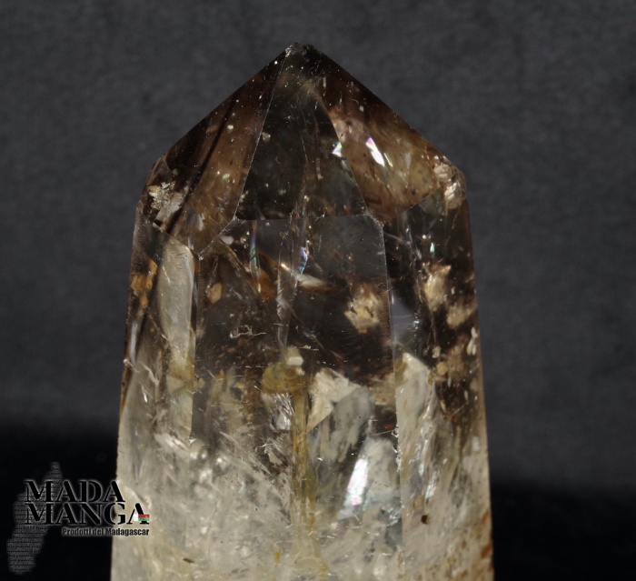 Punta di Quarzo Fumè lucidato di bella trasparenza con piccoli arcobaleni, ialino nella parte inferiore con inclusioni ematoidi, dimensioni cm.3,2x2,7x8,1H, peso 126,7 grammi. Provenienza Madagascar.