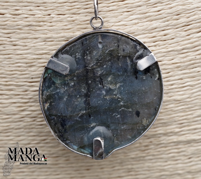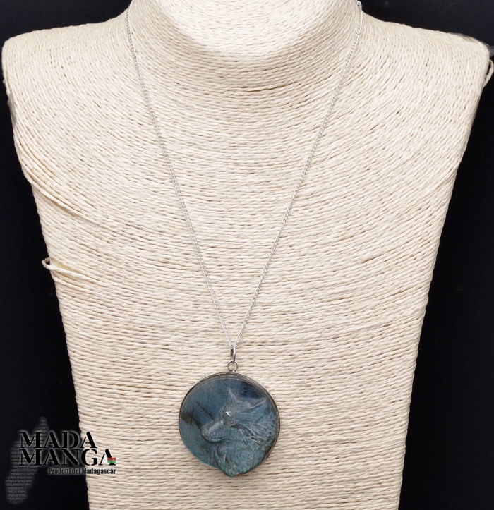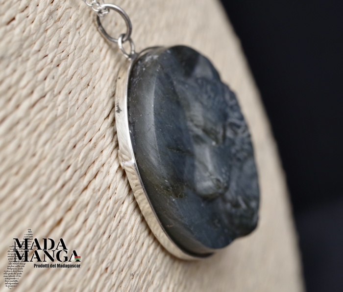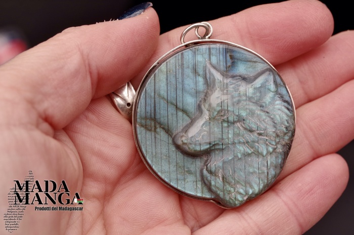Ciondolo in Labradorite a forma di testa di lupo di un bel blu/verde intenso, montato in argento, dimensioni cm.4,2x4,6H, peso 32,8 grammi. Venduto con catenina in acciaio e scatola regalo.