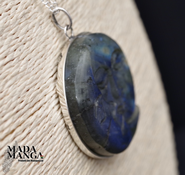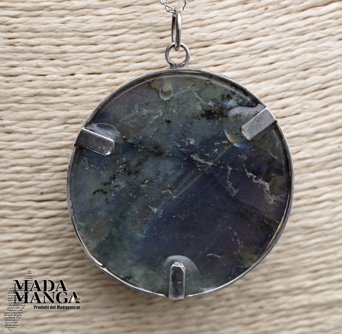Ciondolo in Labradorite sole/luna dai riflessi blu, con montatura in argento, diametro cm.4,2, peso 30,5 grammi. Venduto con catenina in acciaio e scatola regalo.