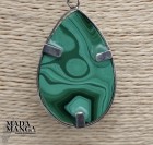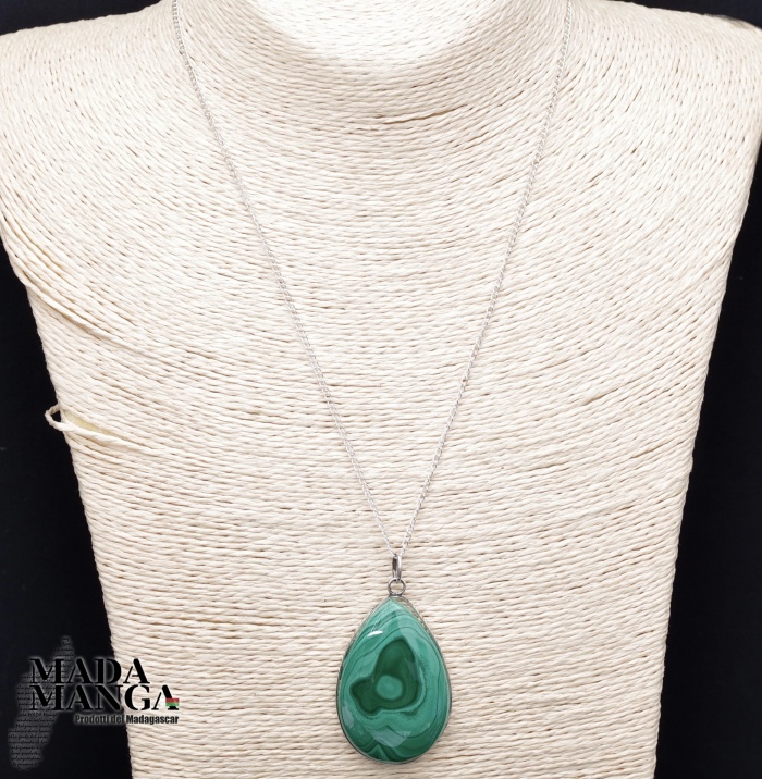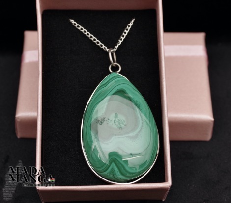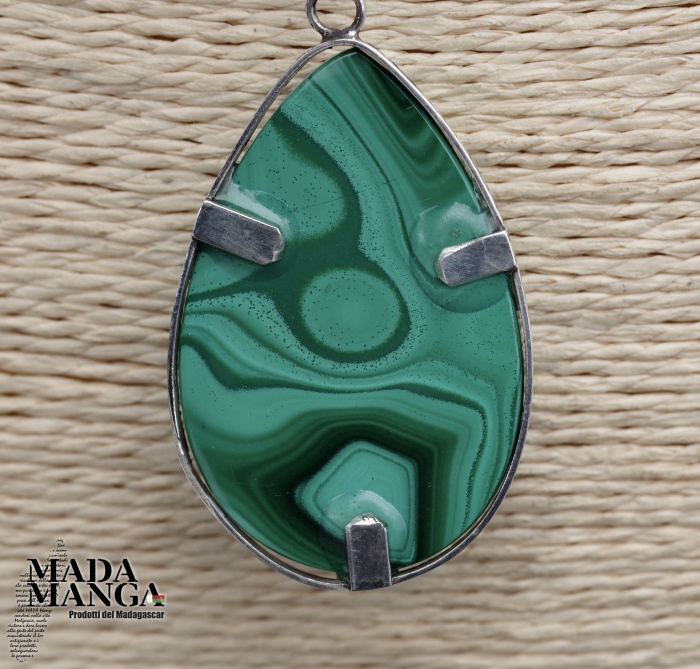 Ciondolo con Malachite dello Zaire montata in argento, dimensioni cm.3x4,4H, peso 24 grammi, venduto con catenina in acciaio e scatolina regalo.