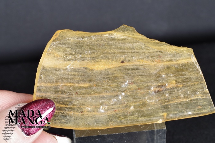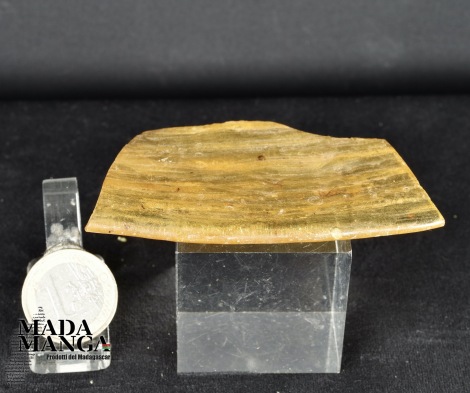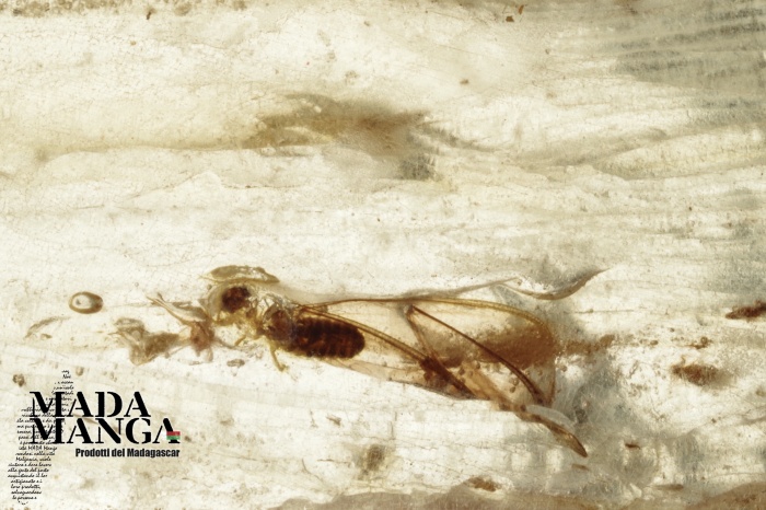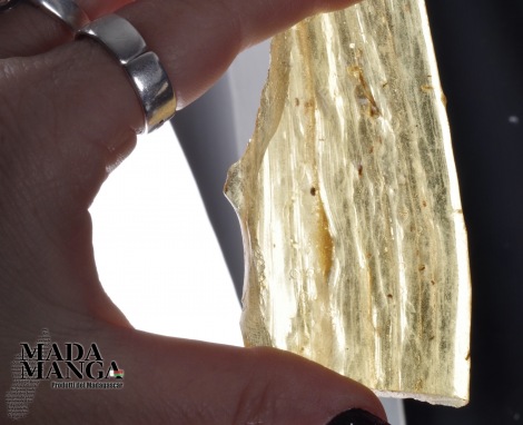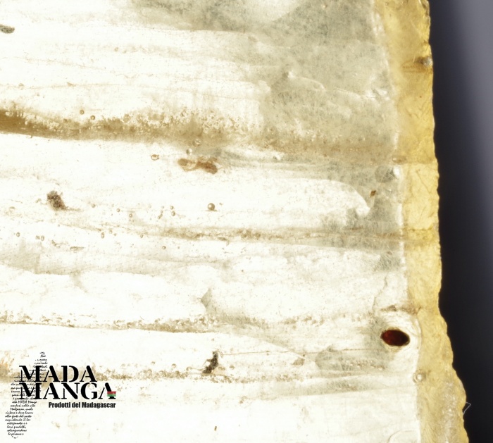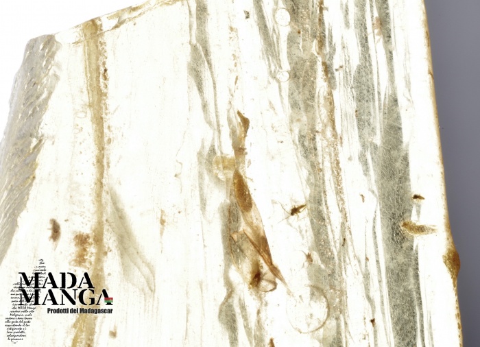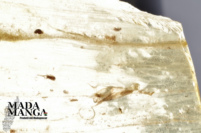Pezzo di Copale (resina sub-fossile) grezza del Madagascar, con inclusione di molto ben definiti, dimensione mm.45x5x82, peso 12,4 grammi.