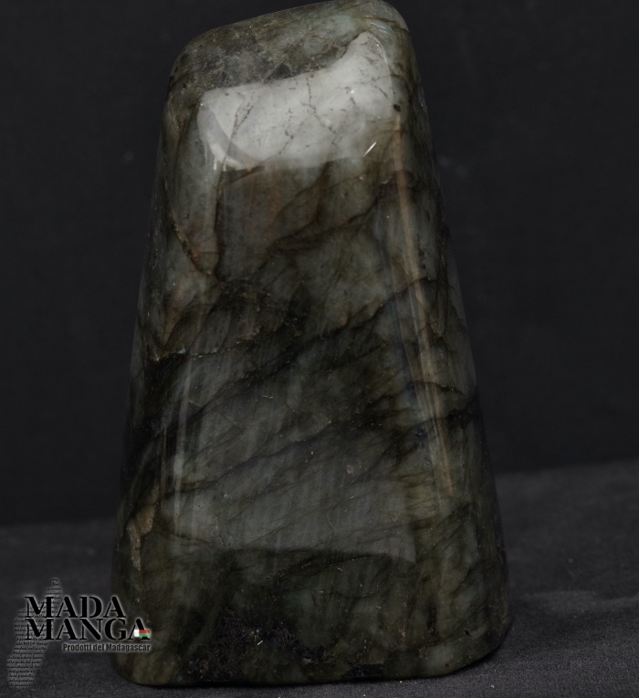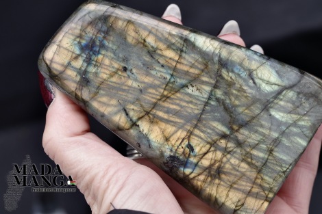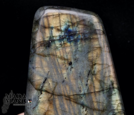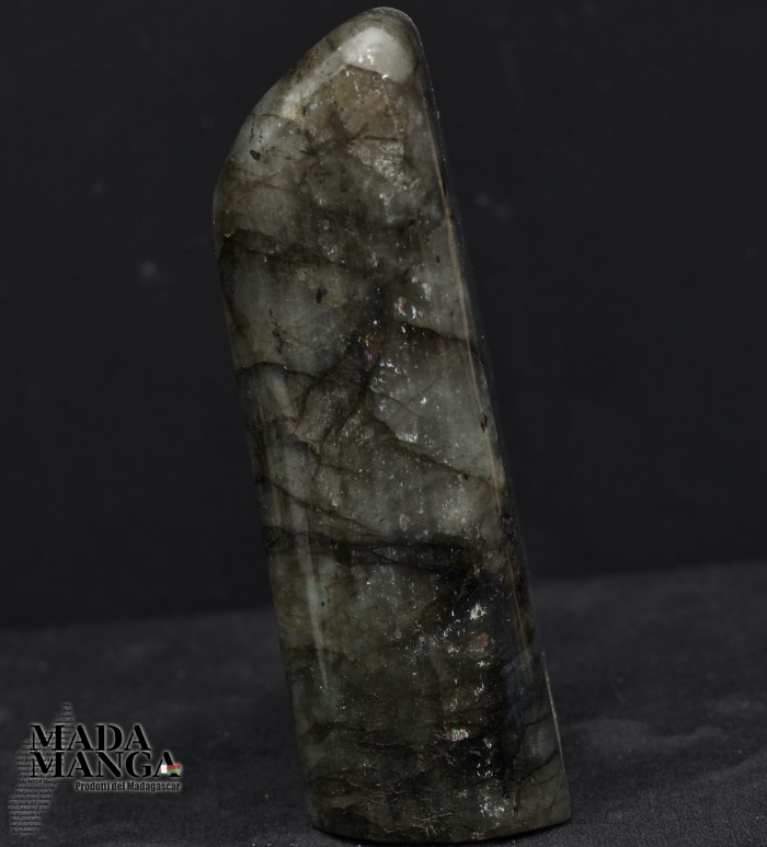 Labradorite del Madagascar in forma libera con intensi riflessi oro, dimensioni cm.6,5x3,3x10,7H, peso 364,5 grammi.
