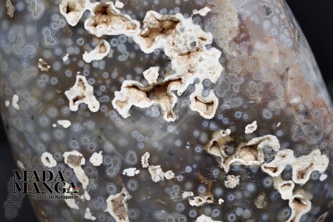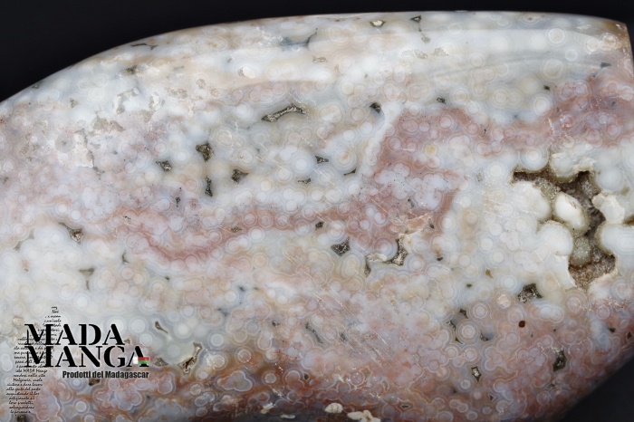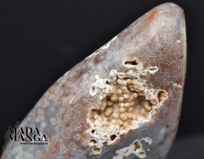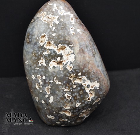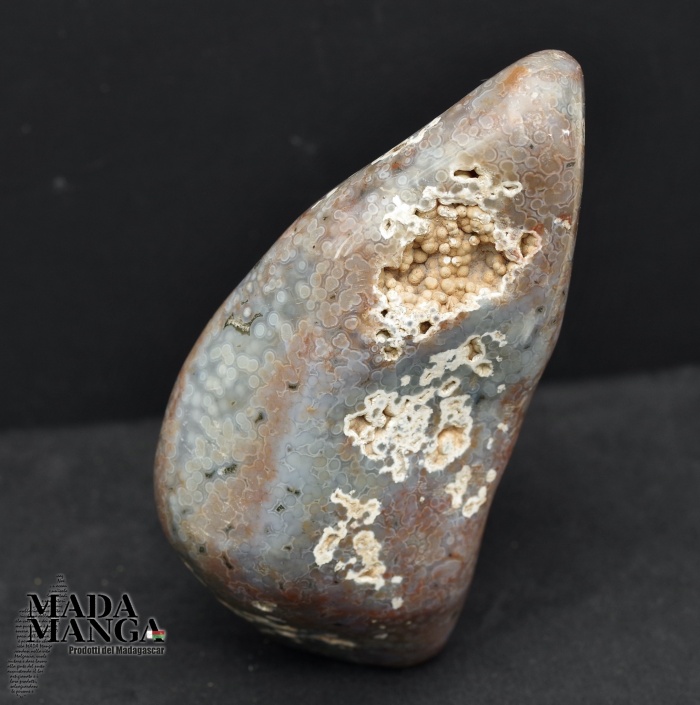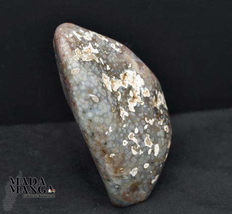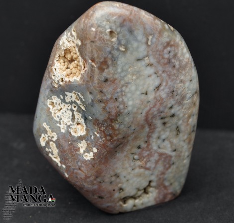 Diaspro oceanico in forma libera, colori dal grigio chiaro al rosato, begli orbicoli, dimensioni cm.9x6,4x13,8H, peso 920 grammi. Provenienza Madagascar