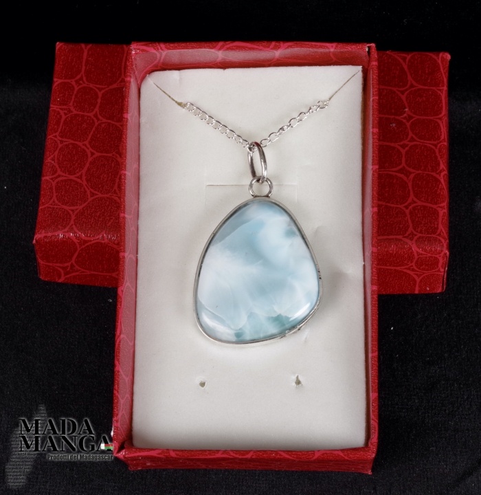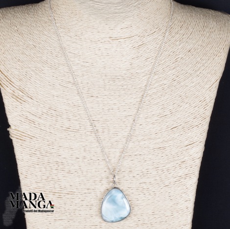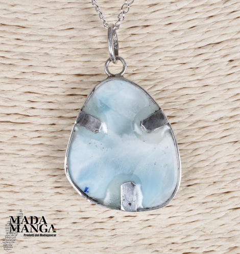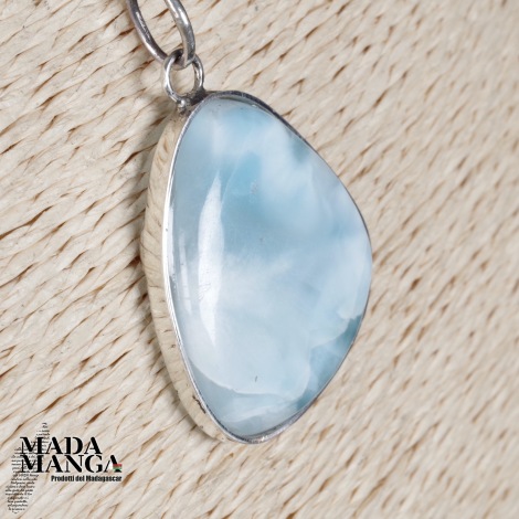 Ciondolo in Larimar di Santo Domingo montato in argento, dimensioni cm.2,5x2,9H, peso 7,4 grammi, venduto con catenina in acciaio e scatolina regalo.