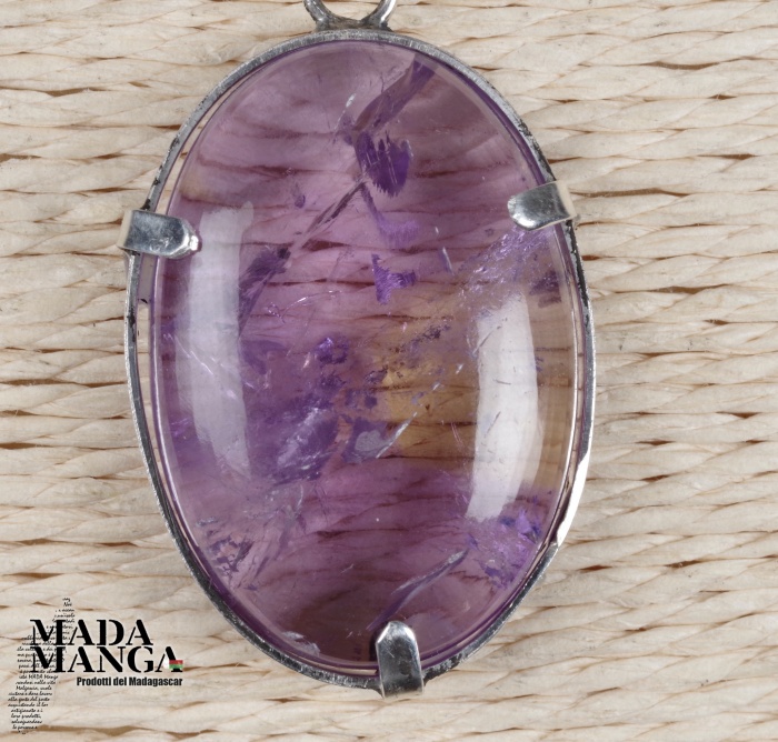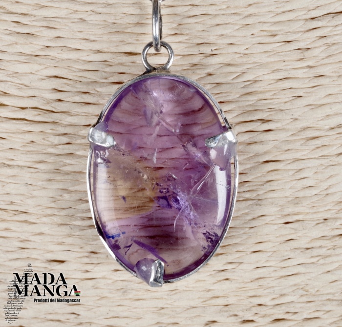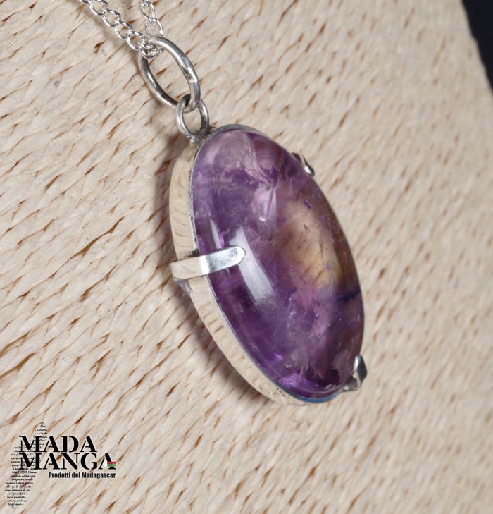 Ciondolo con ametrino molto bello (ametista+citrino di provenienza Brasile) montato in argento, dimensioni mm.21x30H, venduto con catenina in acciaio e scatolina regalo.