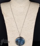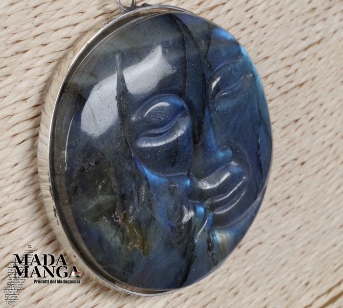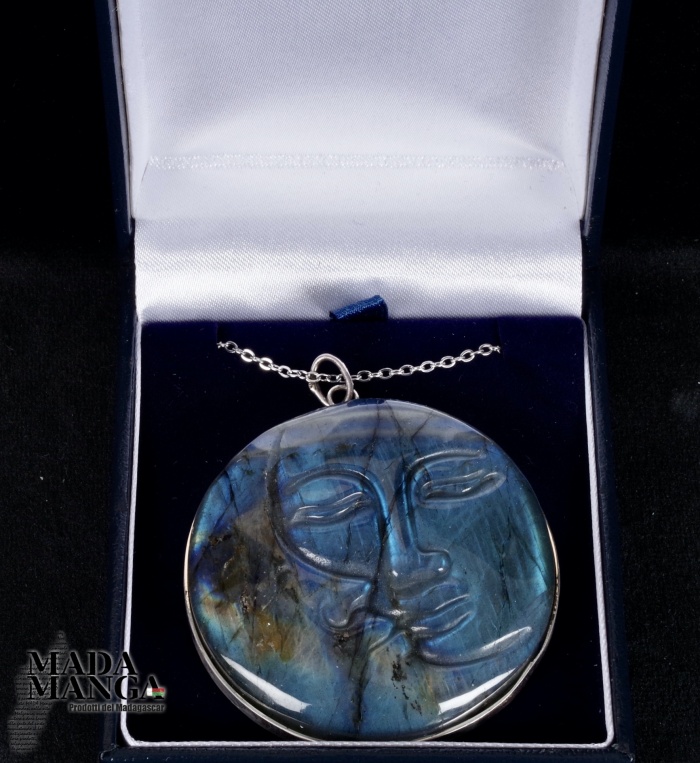 Ciondolo in Labradorite sole/luna con intensi riflessi blu, con montatura in argento, diametro cm.5, peso 48 grammi. Venduto con catenina in acciaio e scatola regalo.