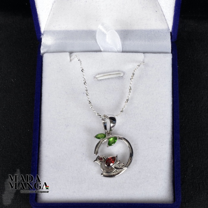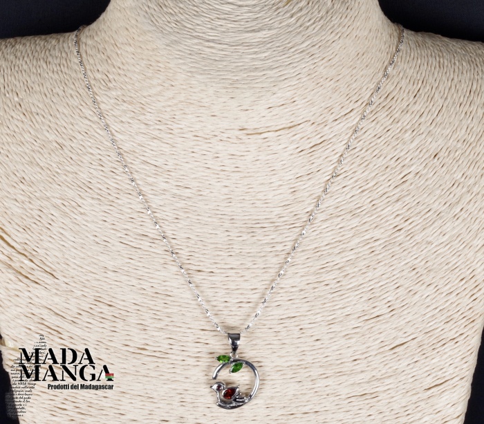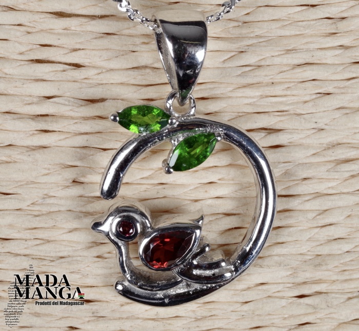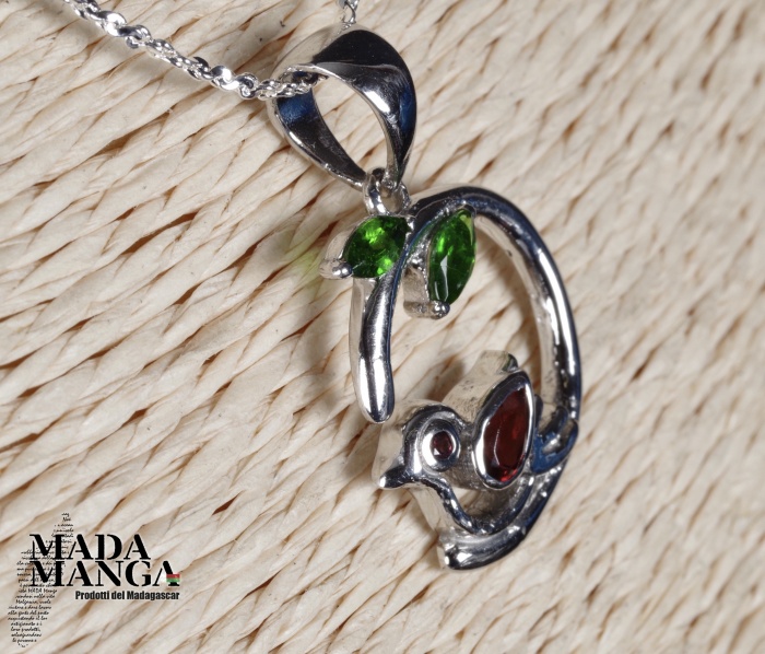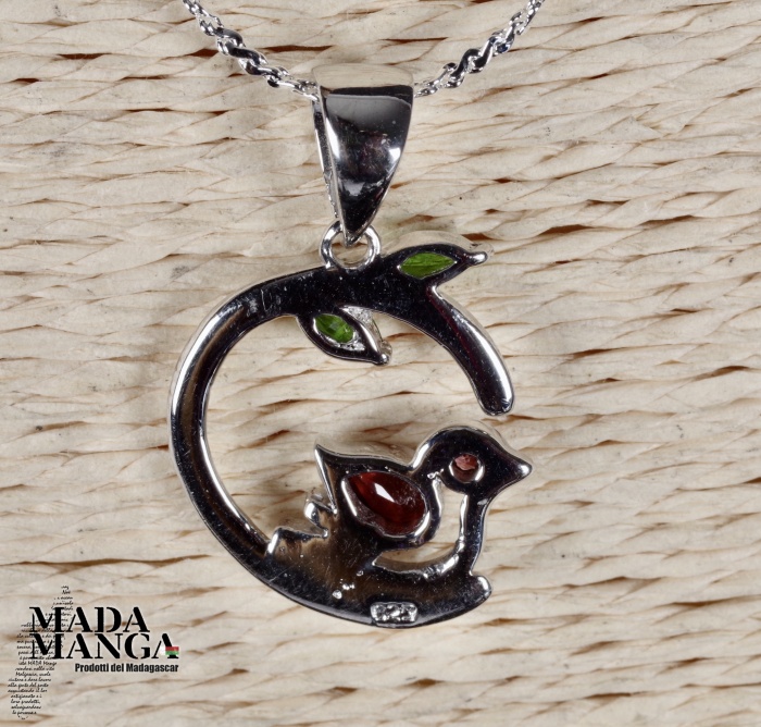 Ciondolo in Argento 925 con placcature in oro bianco, con Granato da mm.6 nell'uccellino e cromo diopsidi per le foglie, dimensioni cm.1,6x1,9. Peso 2,8 grammi. Venduto con catenina placcata argento e scatolina regalo.