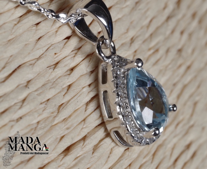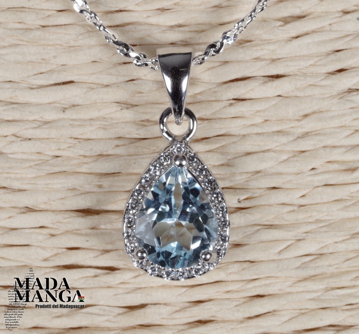 Ciondolo in Argento 925, con placcature in oro bianco, con topazio taglio pear da mm.8x6 e piccoli zirconi, peso 1,1 grammi. Venduto con catenina placcata argento e con scatola regalo.