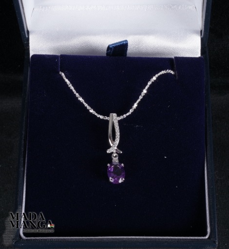 Ciondolo in Argento 925 con placcature in oro bianco con ametista da mm.6x8 e zirconi, dimensione ciondolo mm.7x25H, peso 1,5 grammi. Venduto con scatolina regalo e con catenina placcata argento.
