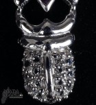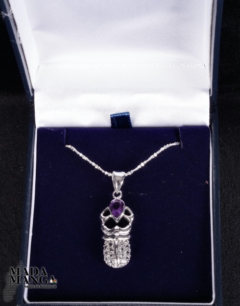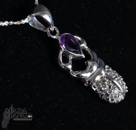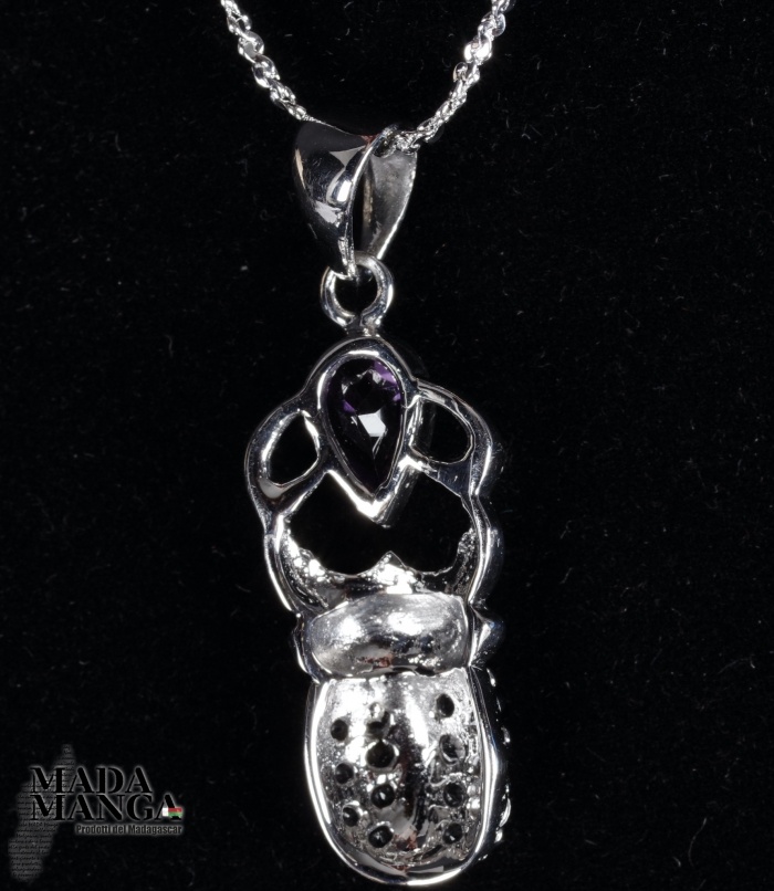 Ciondolo in Argento 925 con placcature in oro bianco a forma di scarabeo con ametista da mm.5x7 e piccoli topazi, dimensione ciondolo mm.12x25H, peso 3,2 grammi. Venduto con scatolina regalo e con catenina placcata argento.