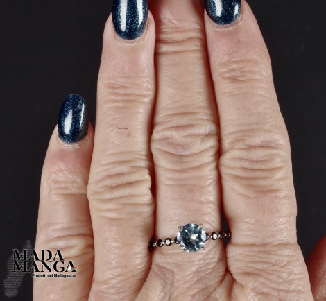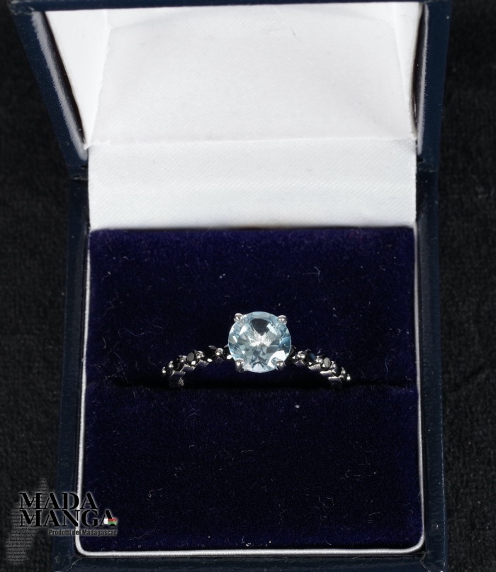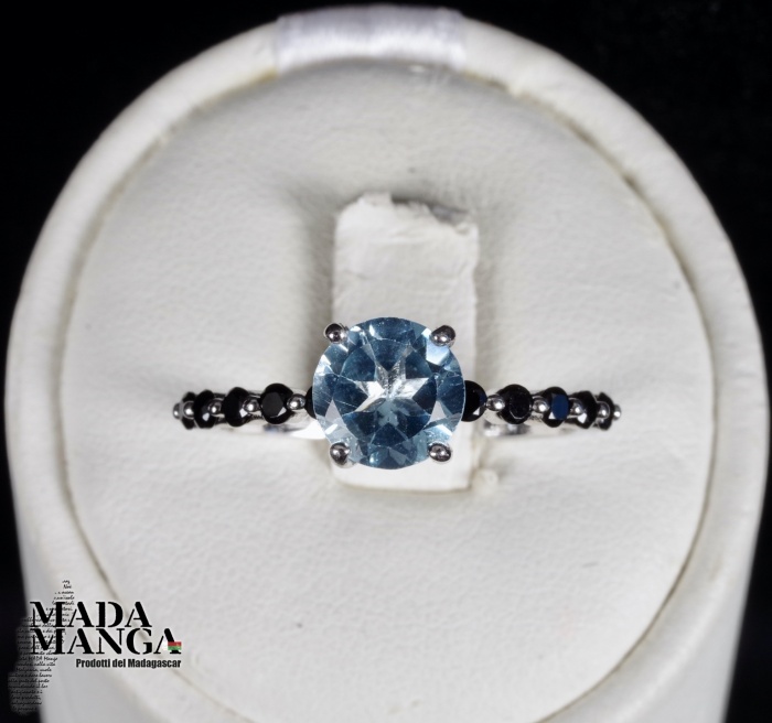 Anello in Argento 925 con placcature in oro bianco, con topazio da mm.7x7 e spinelli neri. Misura americanana 8 , misura italiana 17, diametro interno mm.18,19. peso anello 1,6 grammi. Venduto con scatolina regalo. L'anello è realizzato artigianalmente in pezzo unico per modello e misura