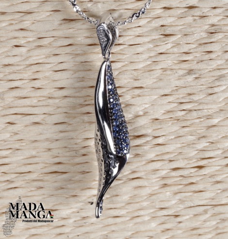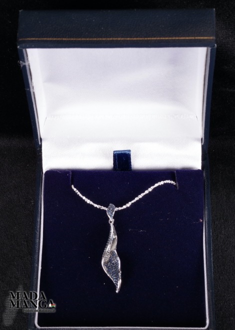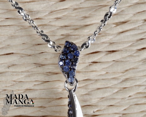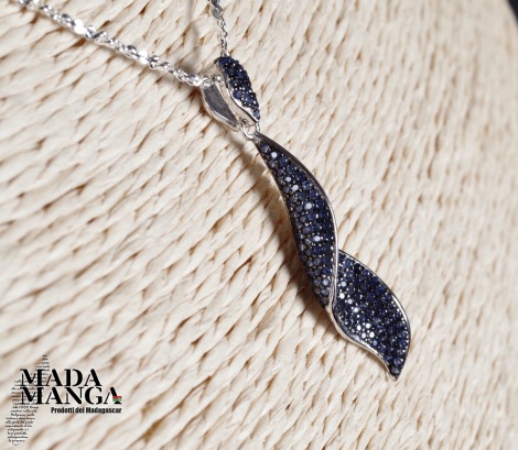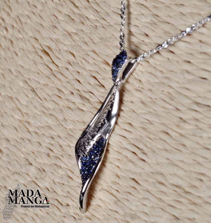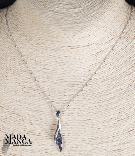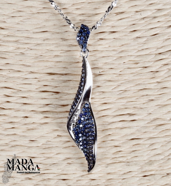 Ciondolo in argento 925 con tempestato di piccoli zaffiri blu, dimensioni mm.8x35H, peso 1,6 grammi. Venduto con catenina placcata argento e scatolina regalo.