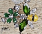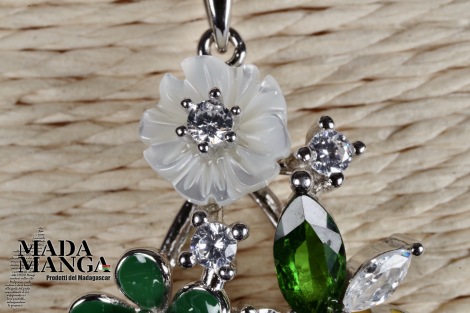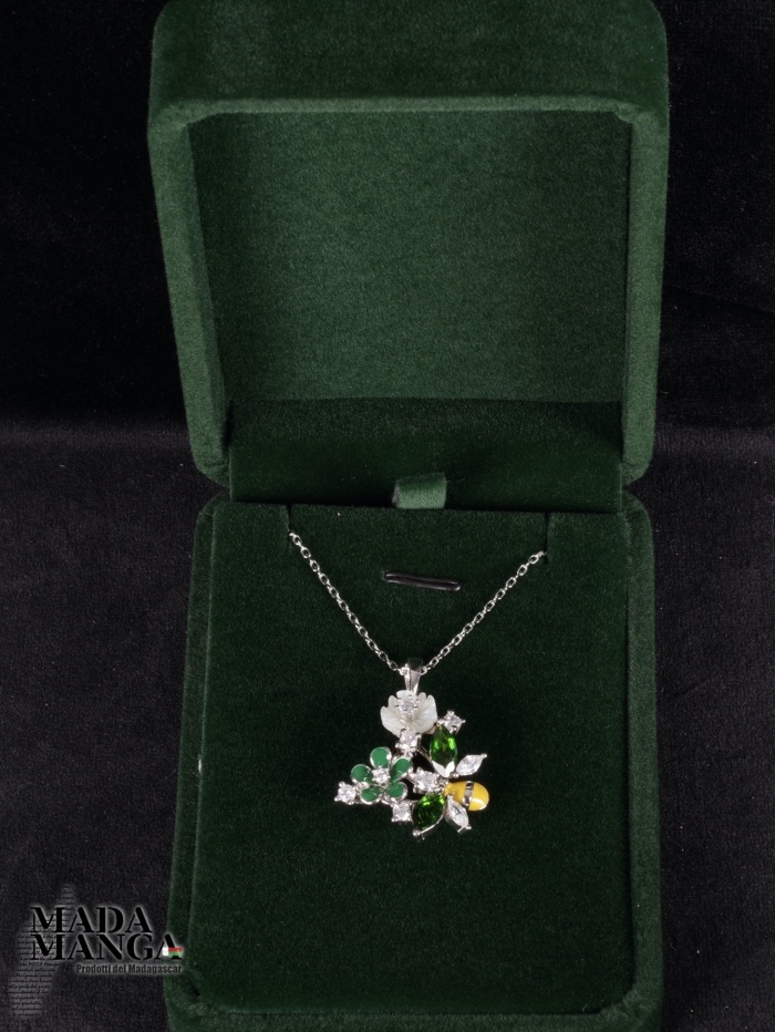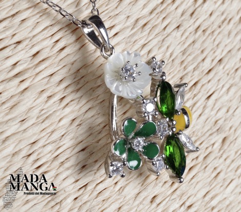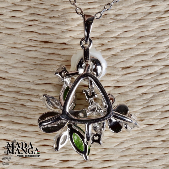 Collana in Argento 925 con placcature in oro bianco, con cromo diopsidi sulle ali dell'ape, madreperla per il fiore, smalti e piccoli zirconi.