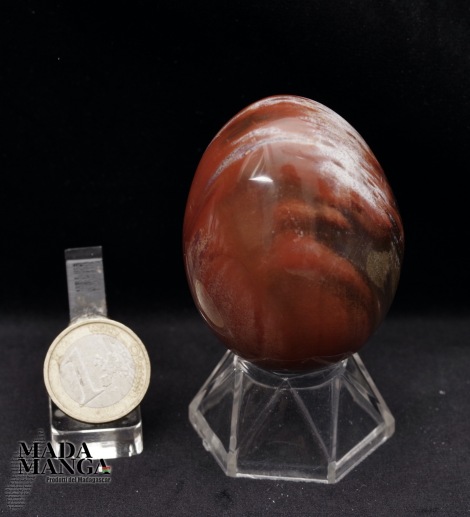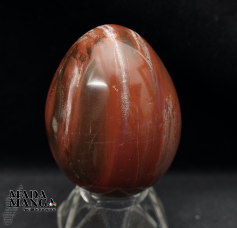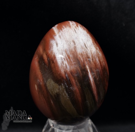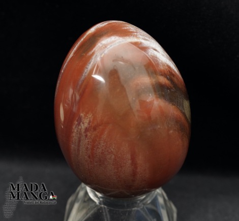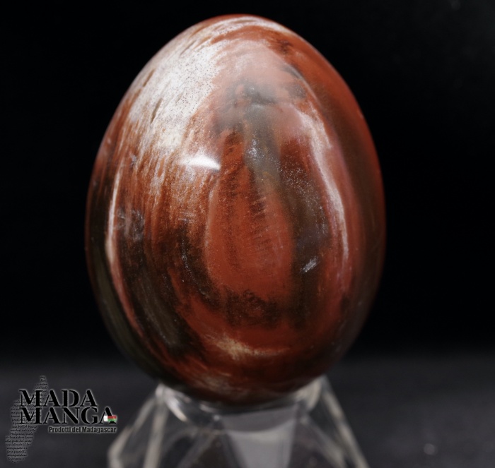 Uovo in Legno Fossile del Madagascar, con sfumature di colore dal marrone al rosso, realizzato a mano, dimensioni cm.4,7x6,2H. Peso 178,5 grammi.
