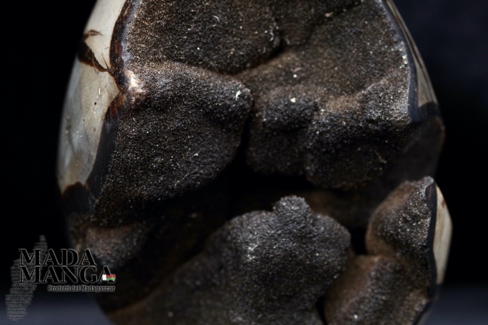 Geode di Septaria lavorato a uovo con cristalli di colore nero intenso, dimensione cm.7x8,3H, peso 427 grammi.