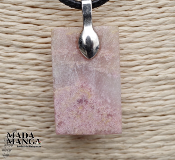 Ciondolo in Rodonite della Val Soana (Piemonte), dimensioni cm.1,7x2,7H, peso 7,3 grammi, venduto con laccetto in corda cerata.
