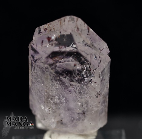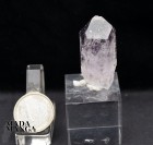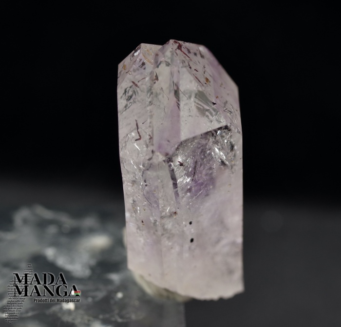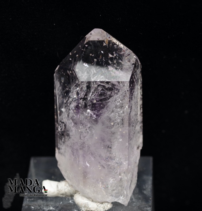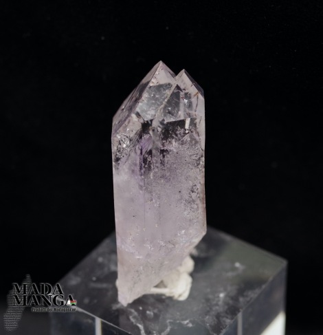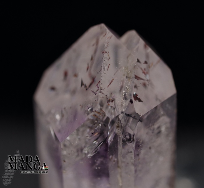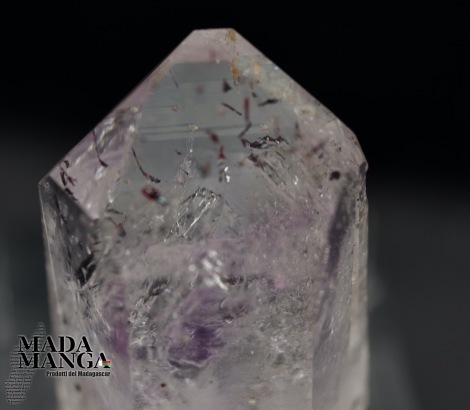 Punta naturale di Quarzo/Ametista con inclusione liquida nella parte con velatura di colore più inteso e inclusione di lepidocrociti e con gemello tantrico, di bellissima trasparenza, dimensioni cm.2,1x1,5x4H, peso 18 grammi, provenienza Namibia.