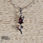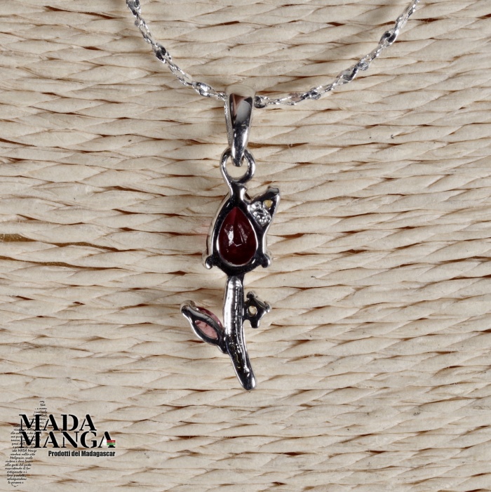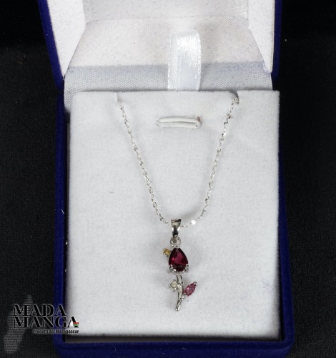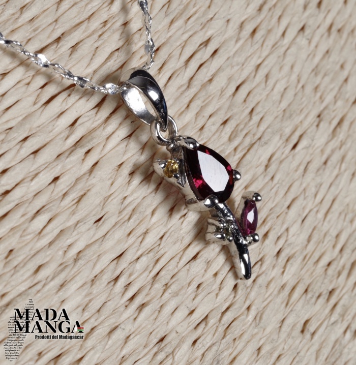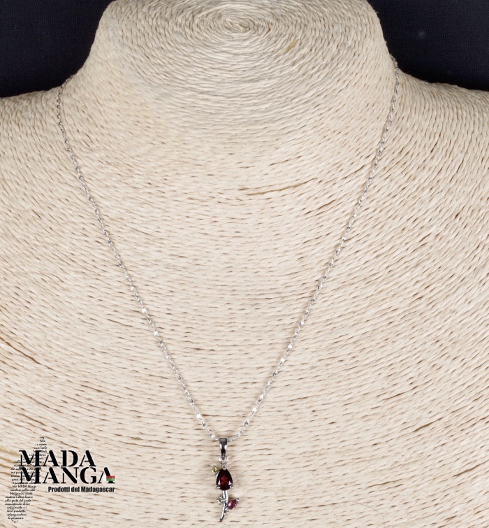 Ciondolo in Argento 925 con placcature in oro bianco, con Granato da mm.7x5, piccoli zaffiri e rodolite, dimensioni mm7x17H. Peso 1,2 grammi. Venduto con catenina placcata argento e scatolina regalo.