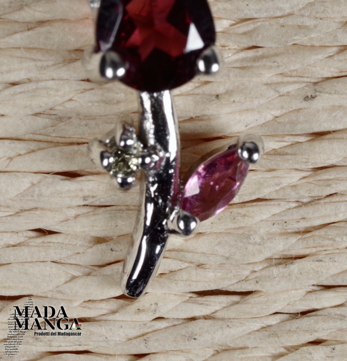 Ciondolo in Argento 925 con placcature in oro bianco, con Granato da mm.7x5, piccoli zaffiri e rodolite, dimensioni mm7x17H.