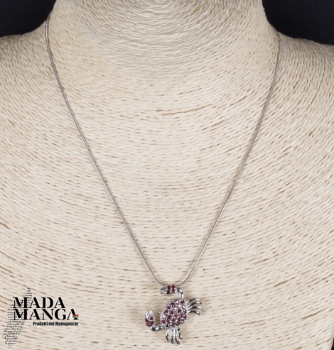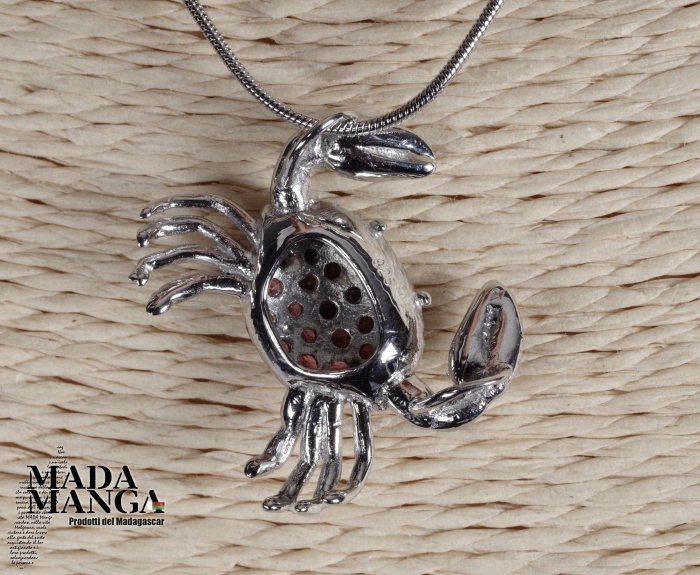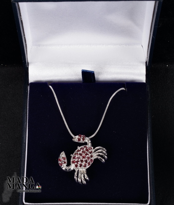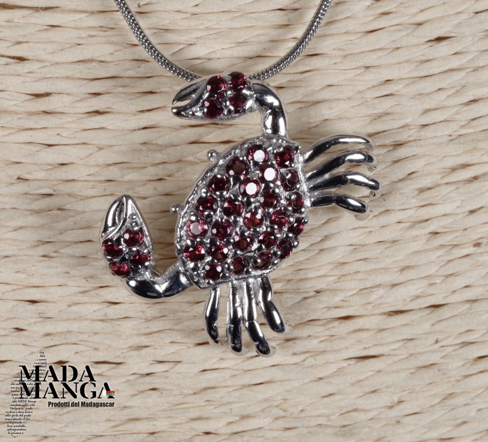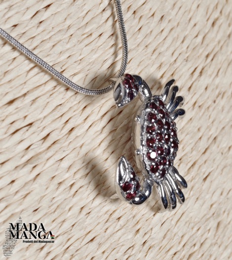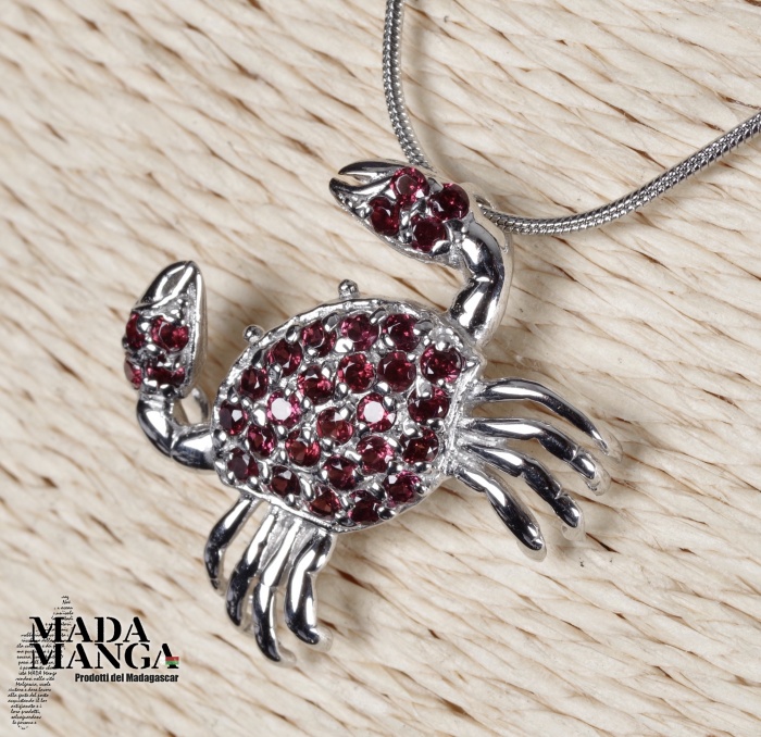 Ciondolo a forma di granchio in Argento 925 con placcature in oro bianco, tempestato di rodoliti da mm.2. Peso 4 grammi. Venduto con catenina in acciaio e scatolina regalo.
