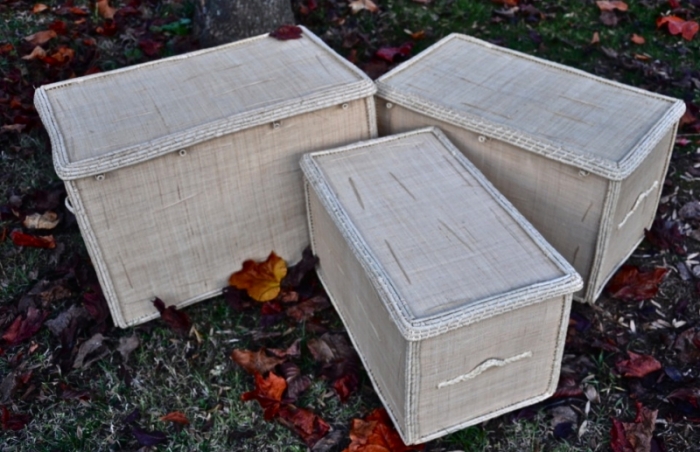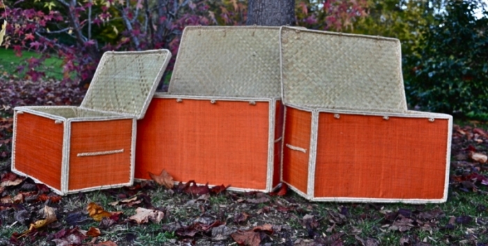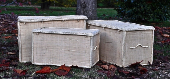 Bauli Portaoggetti in Rafia con manici e coperchio, disponibili in tre misure e colori diversi, realizzati a mano.