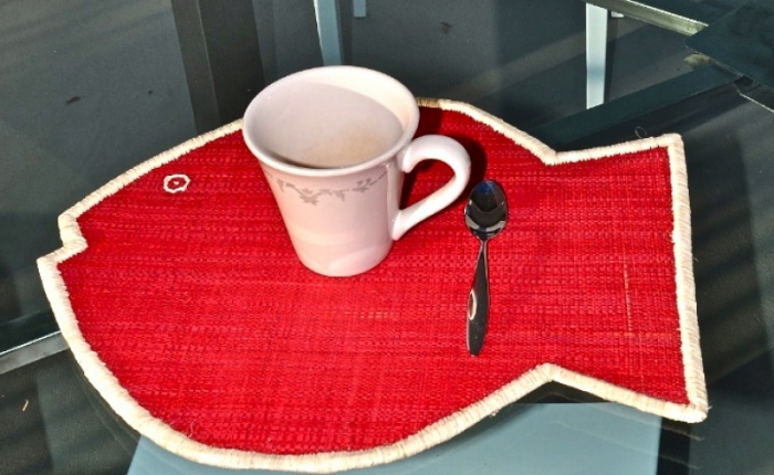 tovagliette sotto piatti in rafia-rabanne a forma di pesce,di dimensioni 40x33 cm,venduti in set da 6 pezzi cad.,in vari colori,interamente realizzati a mano
