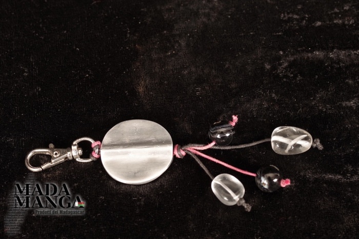 portachiavi con particolari in alluminio riciclato lavorati a mano,con agata e quarzo ialino, chiusura a moschettone in acciaio, lunghezza portachiavi cm 13.I portachiavi possono differire leggermente da quello in fotografia in quanto gli elementi in alluminio e le pietre sono realizzati o lavorati artigianalmente e si possono discostare come misure. La confezione regalo consiste in sacchetto in tulle e scatolina in carta antemoro.