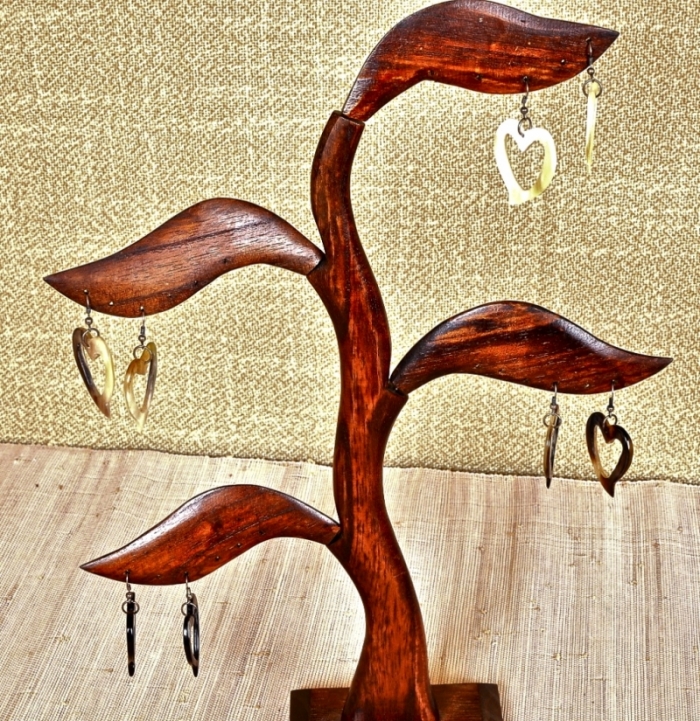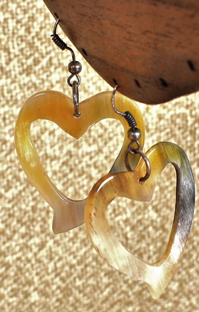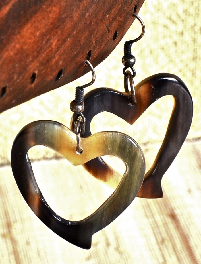 Orecchini in pregiato Corno di Zebù lucidato con forma a cuore, realizzati dagli artigiani del Madagascar.