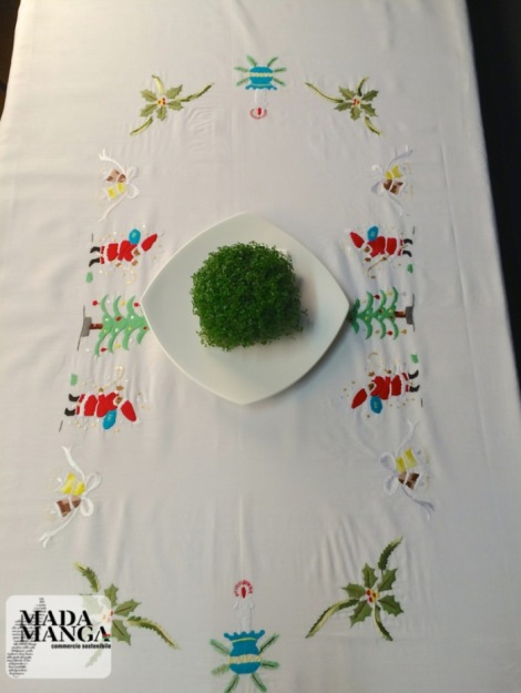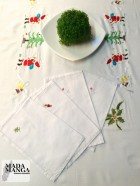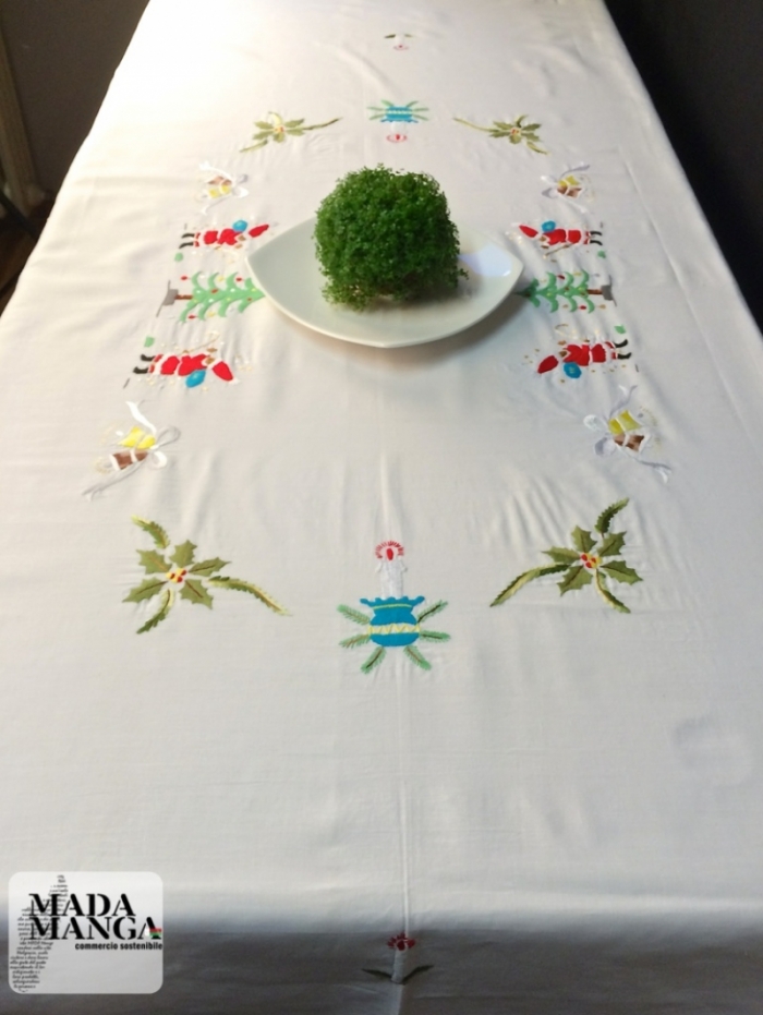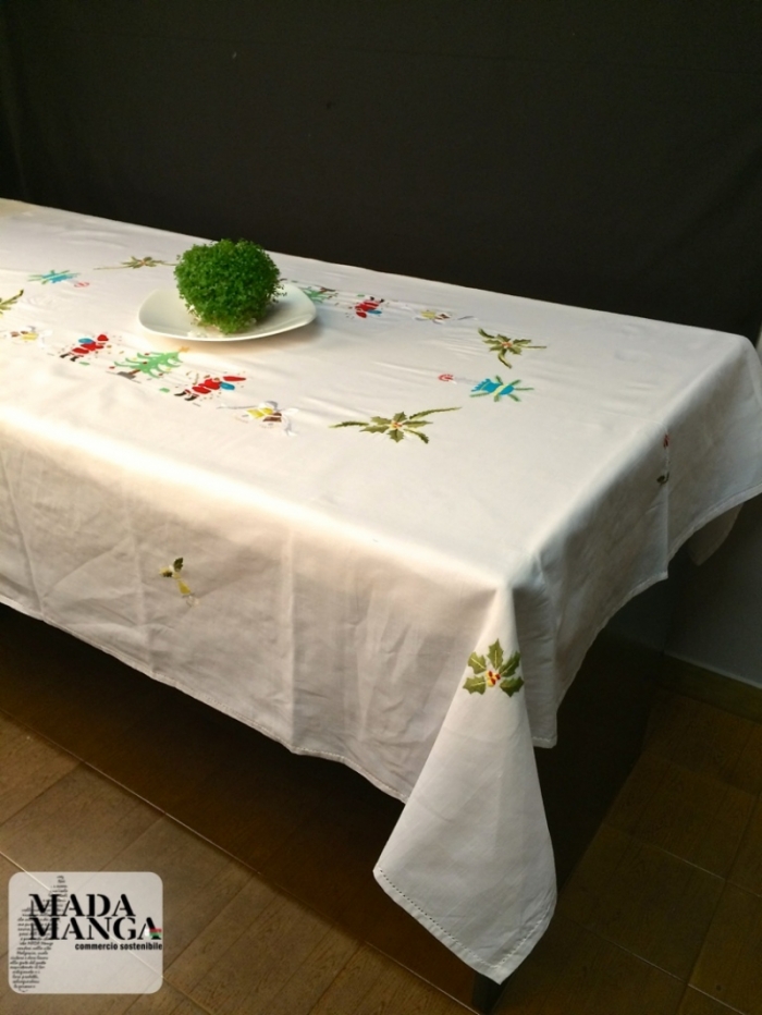 Tovaglia in cotone con n°4 tovaglioli, il tutto ricamato a mano con raffigurazioni di Babbi Natale, dimensioni tovaglia cm.140x180.