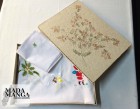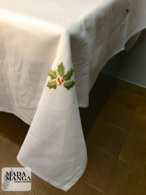 tovaglia in cotone con Ricami fatti a mano raffiguranti Babbo Natale,colore bianco,dimensioni 140x180 cm con 4 tovaglioli anche questi ricamati a mano