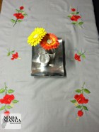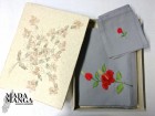 Tovaglia in cotone colore grigio con n°6 tovaglioli, il tutto ricamato a mano con raffigurazioni floreali, dimensioni tovaglia cm.100x185.