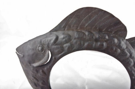 Specchio in ferro lavorato a mano a forma di pesce, con gancio su retro per appendere a muro, dimensioni esterne 38x29 cm , dimensione specchio Diametro 16 cm