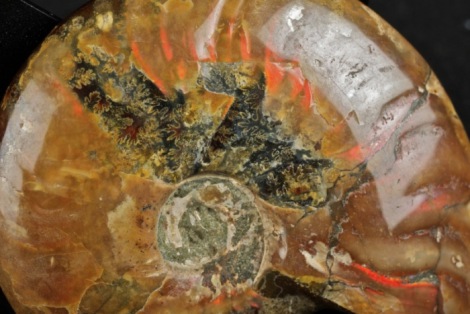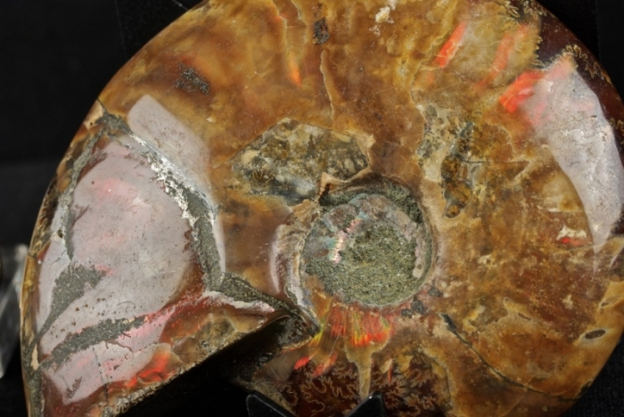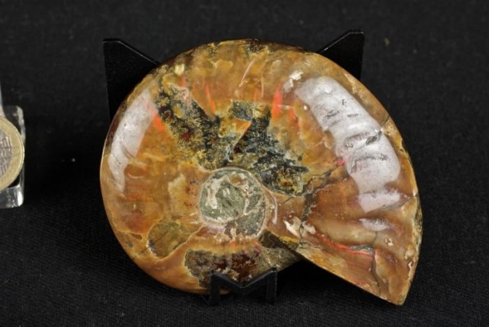 Ammonite intera lucidata con bellissimi riflessi piritizzati, ottimo stato di conservazione, diametro cm.8,5, peso 164 grammi.