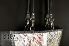 Borsa a secchiello con Manici a Tracolla in tessuto realizzato con strisce di quotidiani rivestite in pvc, interamente cucita a mano.