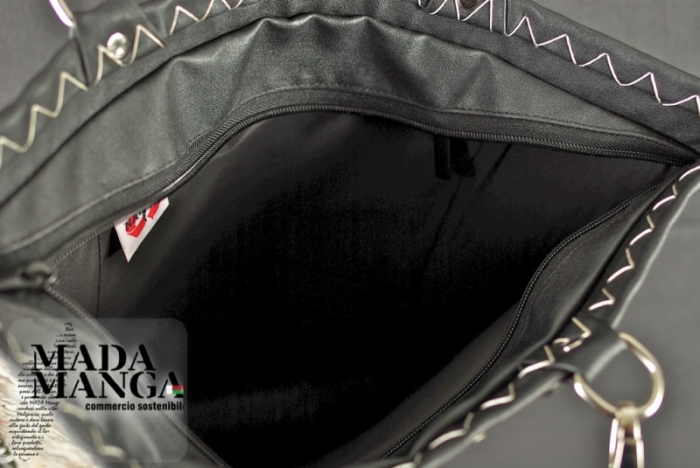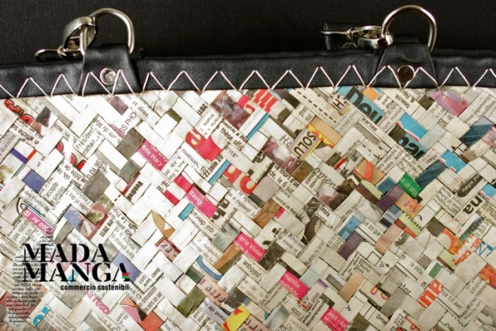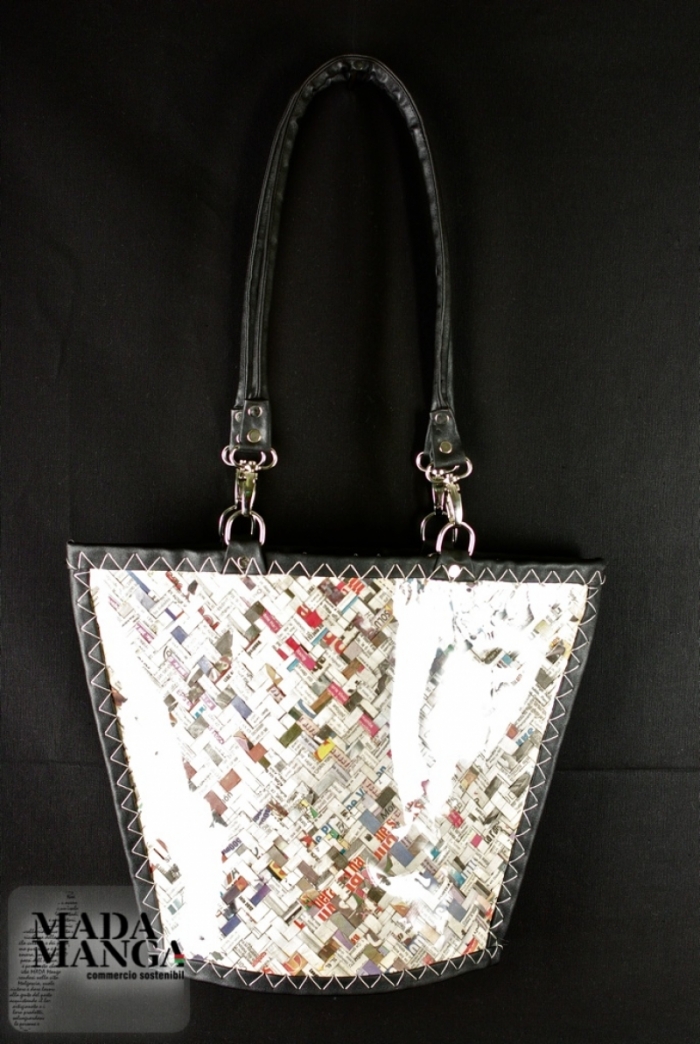 Borsa interamente realizzata a mano con materiali riciclati con particolari unici come il tipo di cuciture e la carta tessuta, la carta è derivata da giornali del Madagascar tagliati e intrecciati a mano, il decoro della carta intrecciata della borsa è rivestita da una pellicola in PVC molto resistente agli urti e al sole, dimensione borsa diametro inferiore 25 cm, diametro superiore cm 40, altezza cm 31, manici altezza cm 34, interno interamente foderato in cotone con tasca porta cose