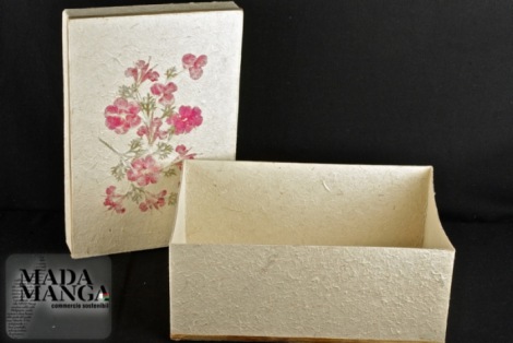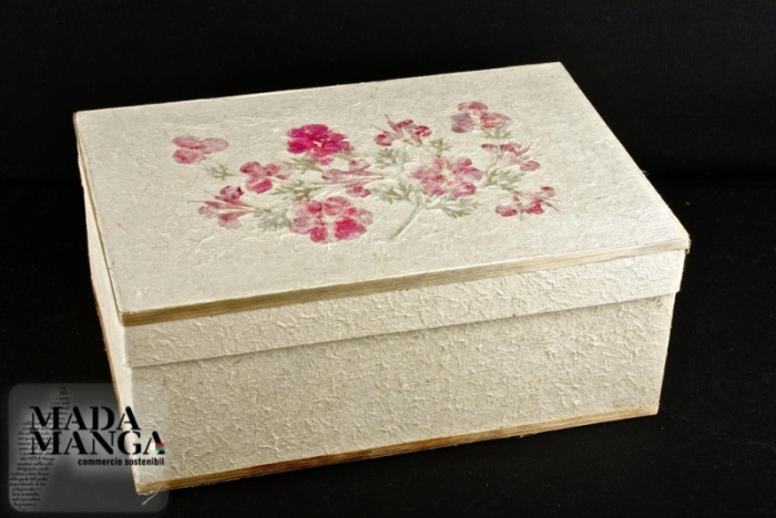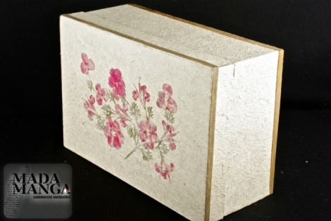 Scatola in carta antaimoro con decoro floreale e bordo in foglio di banano, dimensioni cm.20x30x12H.
