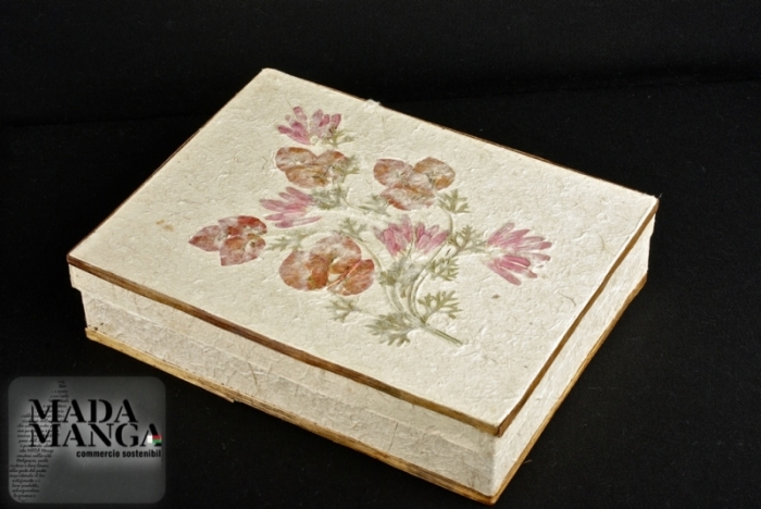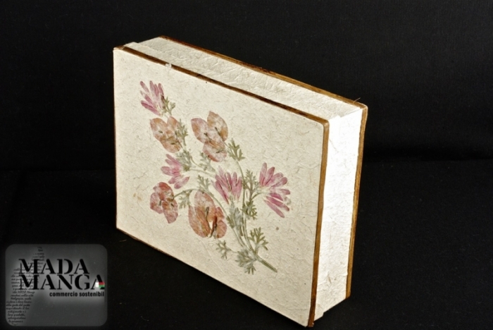 Scatola in carta antaimoro con decoro floreale e bordo in foglio di banano, dimensioni cm.17x22x5H.