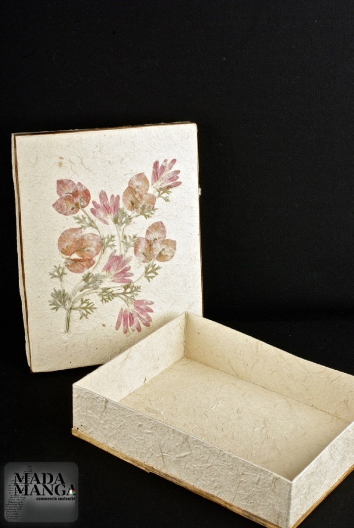 Scatola in carta di antemoro di dimensione 17x22x5 cm altezza, con vari decori floreali su coperchio e con bordatura in foglia di banano, interamente realizzata a mano