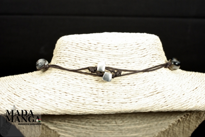 Collana realizzata a mano. Colore marrone con particolari in Alluminio di forma quadrata e Agata. Lunghezza della collana 30 cm. Circonferenza 60 cm.