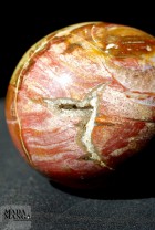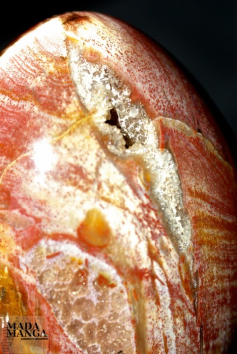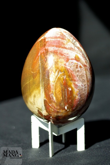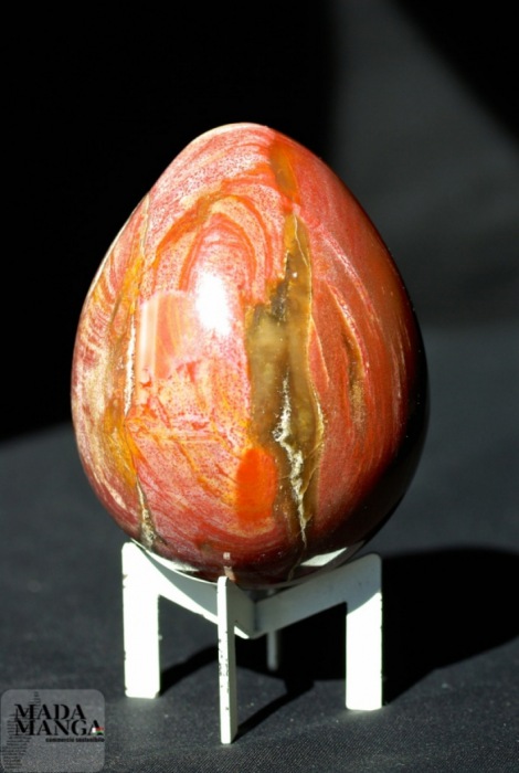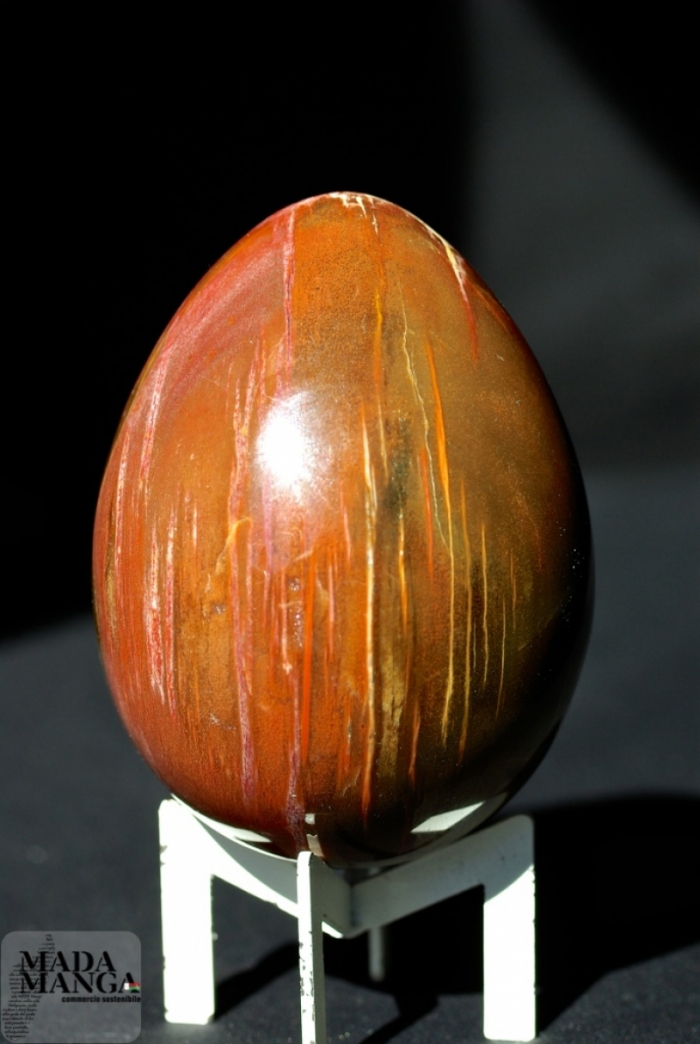 Uovo in Legno Fossile di colori molto caldi, presenza del rosso intenso e di cristalli sulla superficie. Dimensioni 6x8,3 cm altezza. Peso 382 grammi.