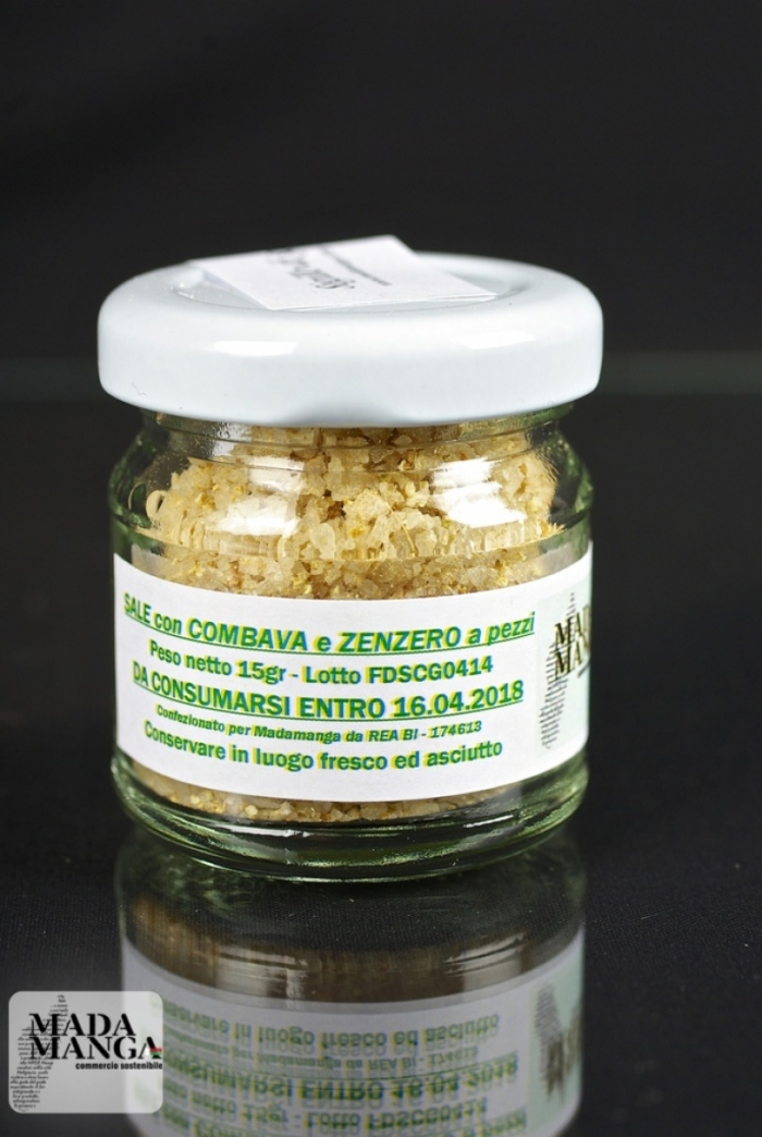 Vasetto da 25 gr. di Fleur de Sel con Combava e Zenzero. La Combava (Nome scientifico Citrus × hystrix) è un agrume. L’estrema acidità della combava non ne permette l’ingestione come frutto fresco, ma non ne limita l’uso in cucina. La sua scorza, infatti, dopo essere stata essiccata, è indicata per salse e piatti di pesce. Ha proprietà anti-infettive ed antisettiche ed è un buon rilassante e sedativo per stati di ansia, stress, agitazione ed insonnia. Tutte le spezie che vendiamo sono state coltivate e lavorate in Madagascar selezionando solo quelle di prima qualità.
