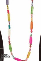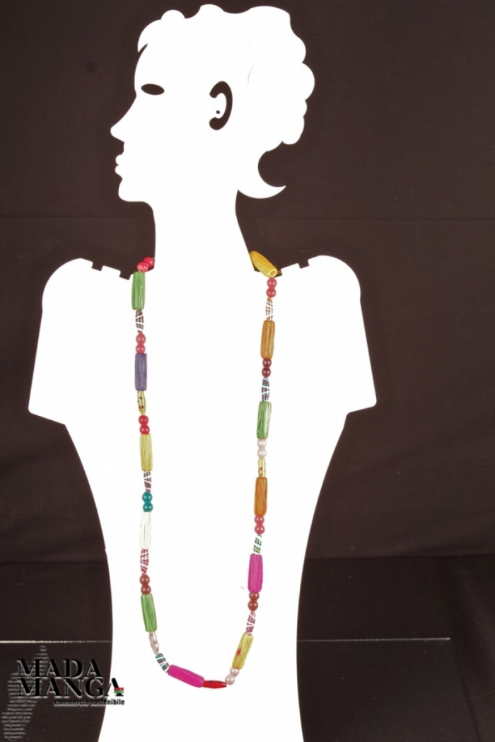 Collana in rafia multicolore con elementi a forma di cilindro, lunghezza totale collana cm.74. La confezione regalo è composta da scatola in carta antemoro con decoro floreale