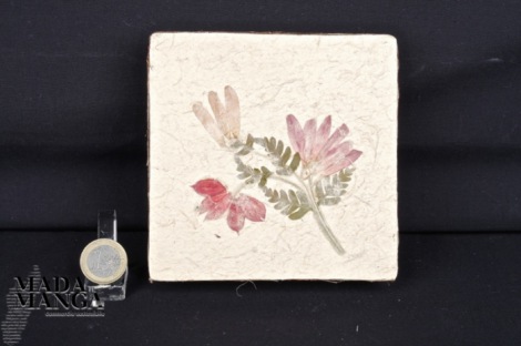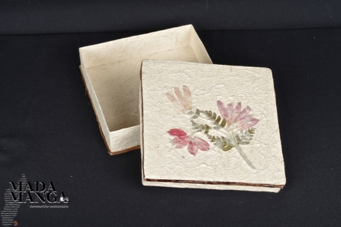 Scatola in carta di antemoro di dimensione 12x12x3 cm altezza, con vari decori floreali su coperchio e con bordatura in foglia di banano, interamente realizzata a mano.