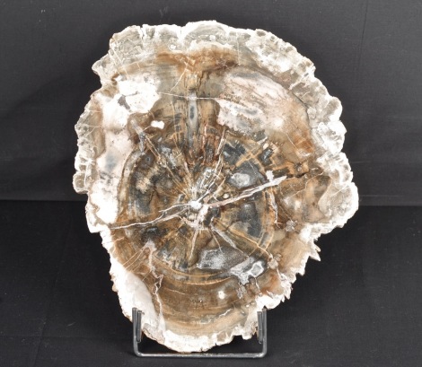 Supporto in metallo cromato per fette in legno fossile e ammoniti di grandi dimensioni (oltre cm.20 diametro). Dimensioni cm.13,5x15x14,5H