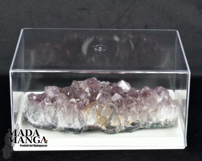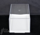 Scatola in plastica trasparente con base bianca per contenimento minerali e fossili da collezione.