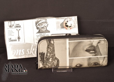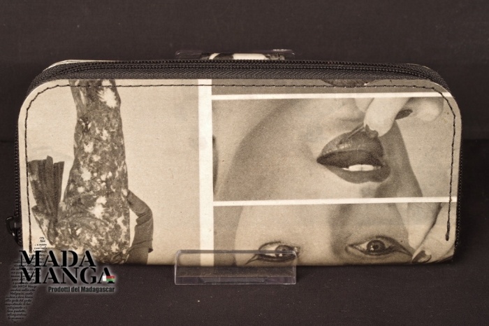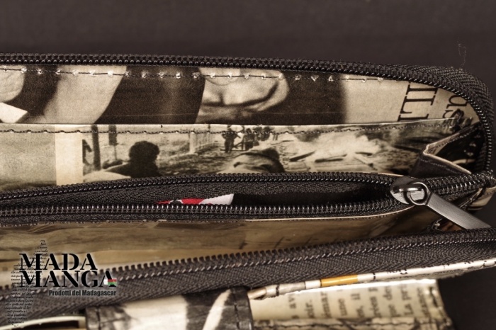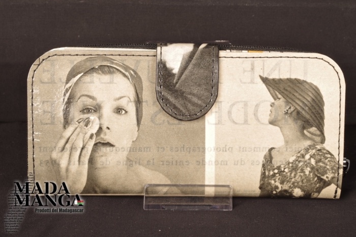 Portafoglio da donna interamente realizzato a mano con materiali riciclati. Le stampe sono fatte con giornali originali francesi degli anni 60. Questo fa si che ogni oggetto sia unico, e che la stampa sia differente su entrambi i lati e all'interno. Rivestito da una pellicola di PVC resistente al sole, acqua e urti. Diviso in 2 scomparti principali: uno per le carte e l'altro per contanti e monete fornito di cerniera. Venduto con la propria confezione, anch'essa di carta di giornale francese del 1960. Dimensioni: 22x10 Cm.