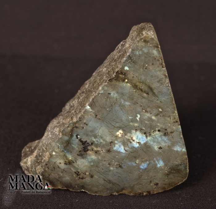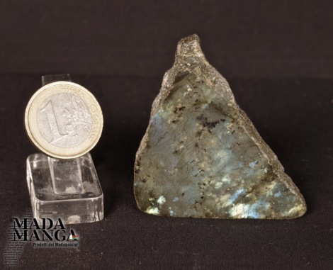 Labradorite del Madagascar in forma libera con parte lucida e parte grezza, con riflessi blu e oro sulla superficie lucida, dimensioni cm.5x4,7x2,4 spessore. Peso 88 grammi.